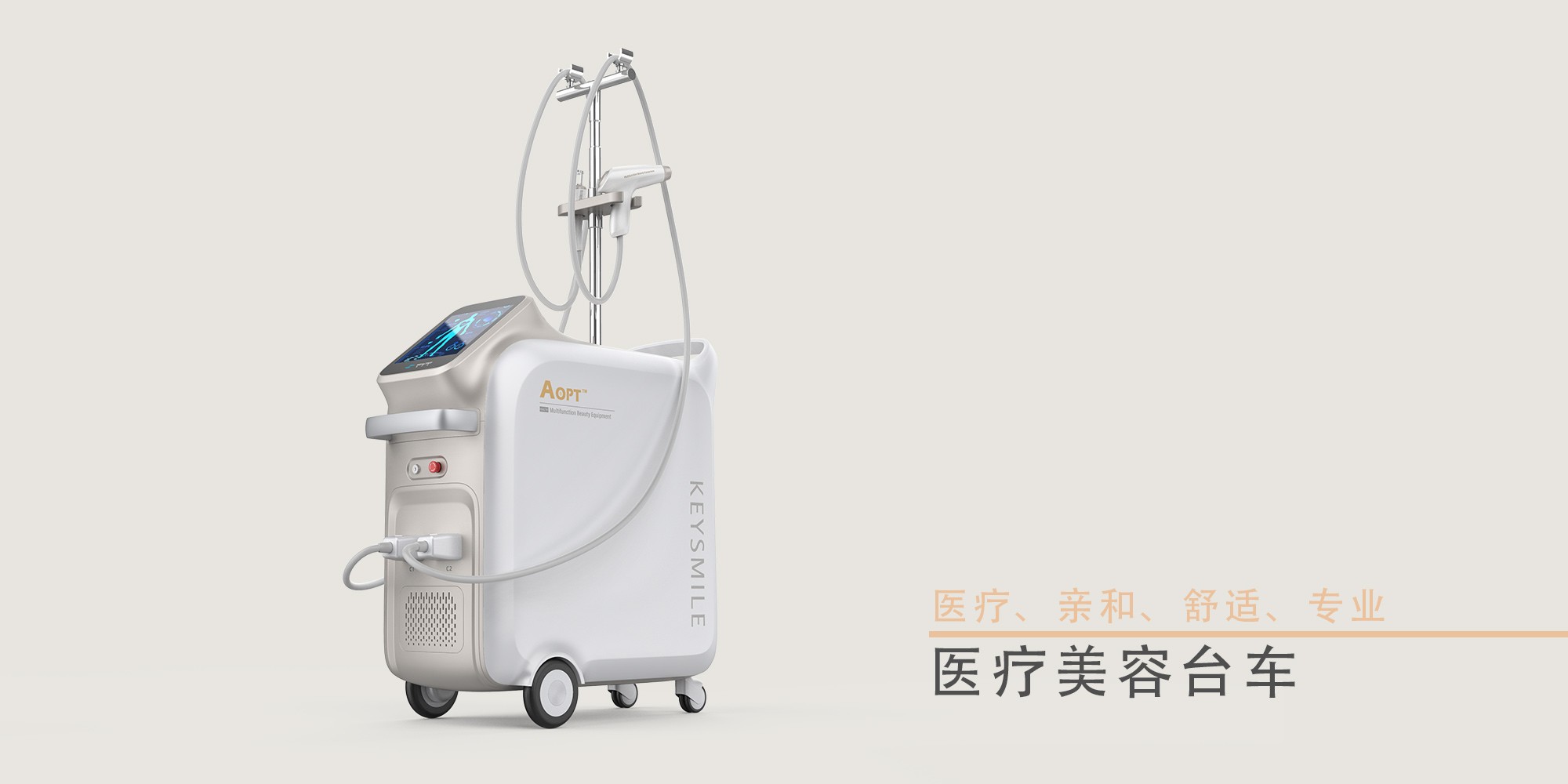 這款光子嫩膚美容臺車的設計簡約、時尚,運用柔和的曲線條打造產品的親切感和舒適感。簡潔的白色搭配素雅的香檳色凸顯產品干凈特點,打造產品的輕奢氛圍。機身比例合適,方便移動,手柄小巧精致,能夠給操作者帶來舒適的握持感。