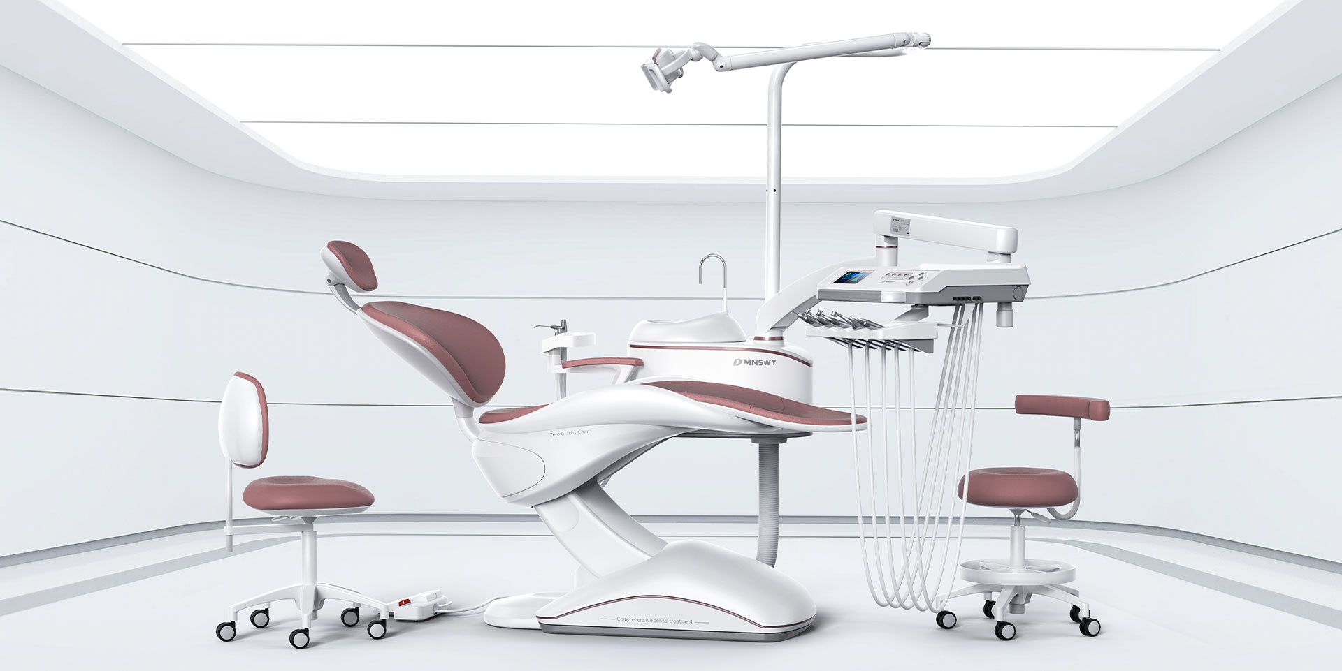 治療椅整體采用金屬材質骨架和底座,符合人體工程學的靠背設計,治療椅表面皮革采用接觸面無縫工藝縫制。整體顏色采用白色,搭配皮革和金屬兩種材質的玫瑰金色,流線型造型設計凸顯產品的優雅美觀。